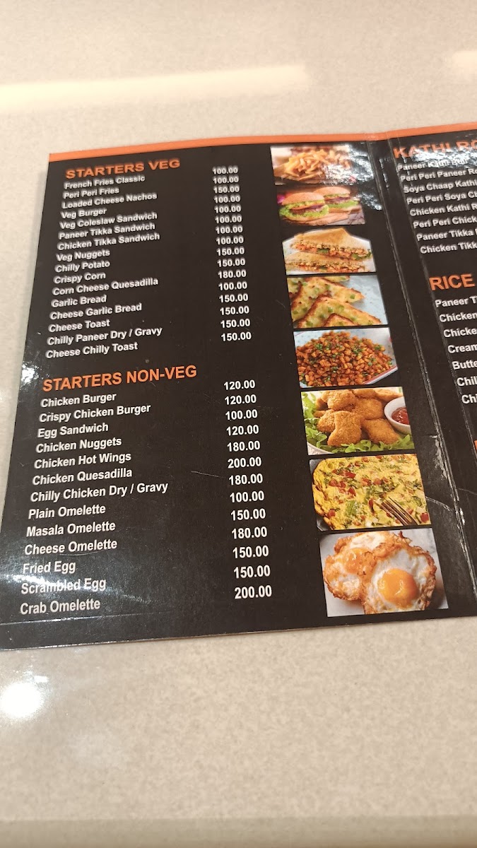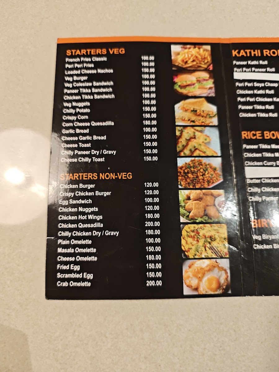 The menu offers a variety of options categorized to suit different dining preferences throughout the day. It includes a selection of starters featuring vegetarian and non-vegetarian sandwiches, fries, and snacks such as French Fries, Peri Peri Fries, Veg Nuggets, Paneer Tikka Sandwich, and Chicken Tikka Sandwich. These items serve as light bites suitable for casual meals or snacks.